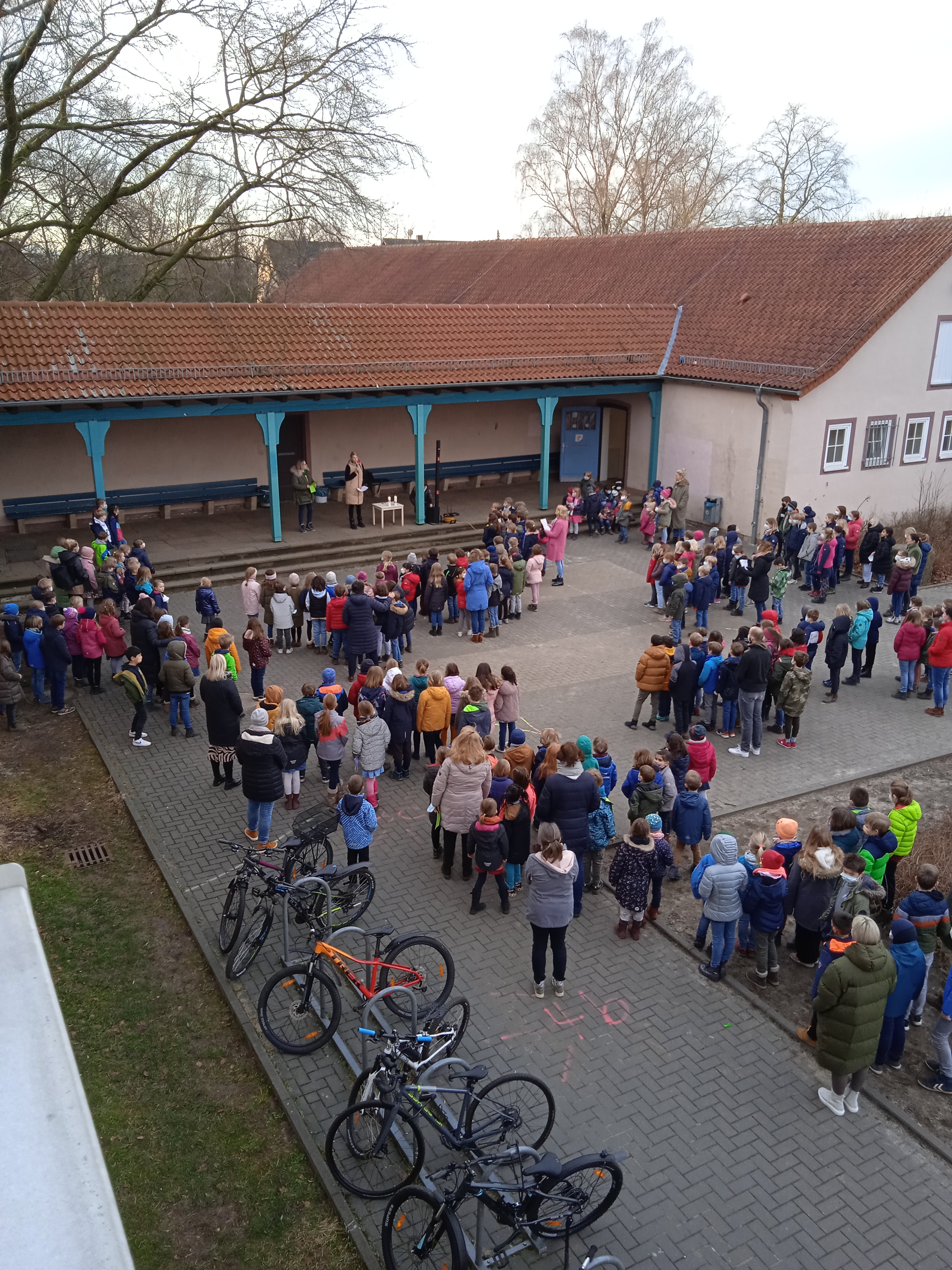 Über ein politisches, reflektiertes Verständnis, das über Jahre gereift ist, verfügen unsere SchülerInnen noch nicht. Wir verstehen es jedoch täglich als unsere Aufgabe, dieses anzubahnen und so können wir die unfassbar traurige, erschütternde Situation in der Ukraine nicht unangesprochen lassen. Darum versammeln wir uns morgen auf dem Schulhof, um ein Friedensgebet zu sprechen und eine Minute des Schweigens zu halten. Wir wollen vor allem danken, dass wir in die Schule gehen können und hier sicher sind sowie weltweiten Frieden wünschen, besonders für die aktuell von Krieg und Verfolgung betroffenen Menschen. In einem Friedensfenster, das wir gestalten, wird bis zum hoffentlich baldigen Ende des Krieges immer ein Licht brennen.