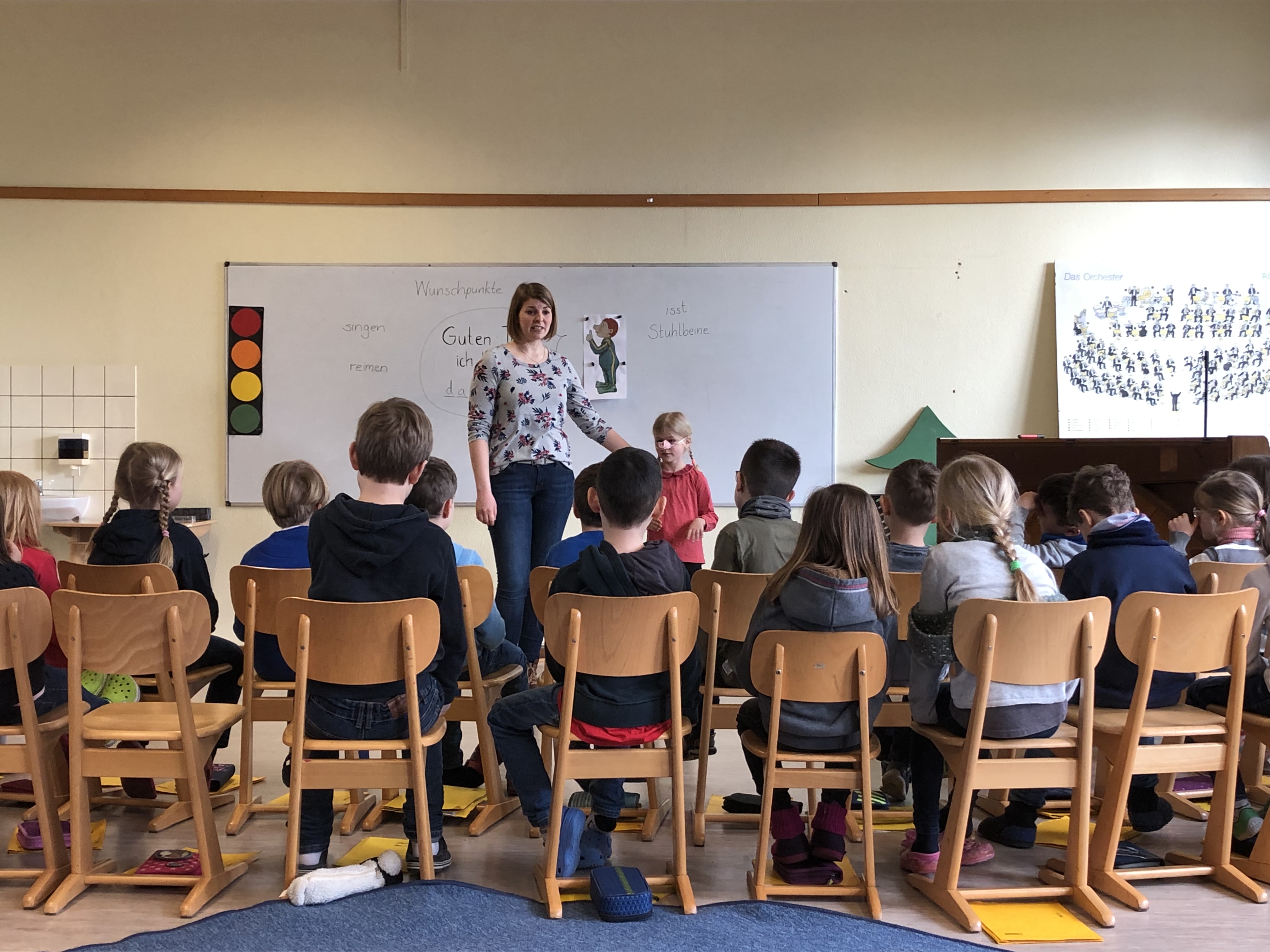 Im Fach Deutsch ging es zum Beispiel um das Thema „Wünsche und Träume“. Jedes Kind überlegte sich seine größten Wünsche und gestaltete dazu zwei Wunschpunkte. Außerdem besprachen die Kinder gemeinsam verschiedene Redensarten, die das Sams gerne beim Wort nimmt, und stellten diese als Standbilder dar. Kennst du dich schon gut aus und kannst die passenden Redewendungen herausfinden? (6 Quizbilder zusammen)