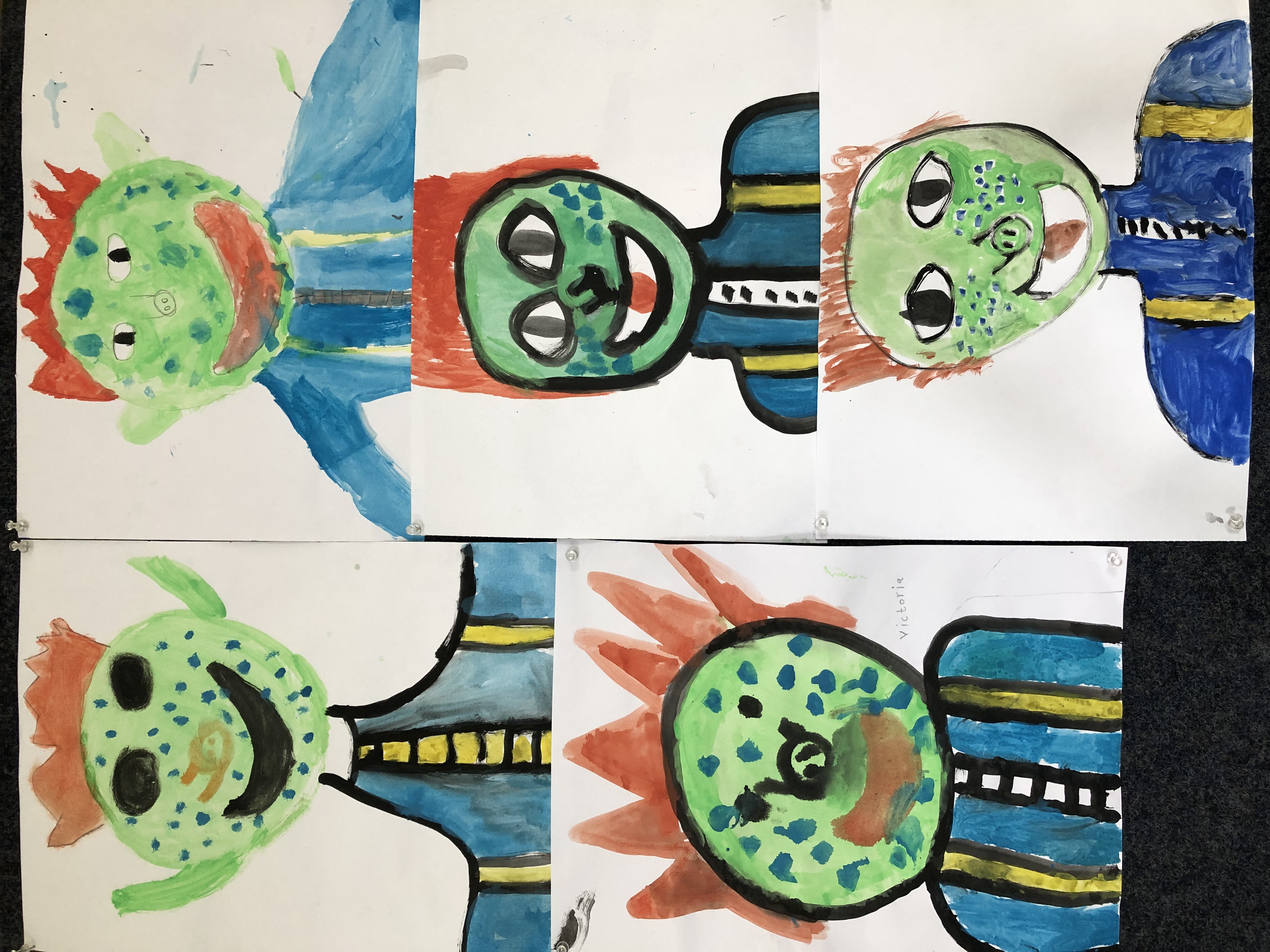 Schließlich malten die Kinder im Kunstunterricht ein Porträt des Sams‘, wie es im ersten Band von Paul Maar „Eine Woche voller Samstage“ beschrieben wird. So entstand in unserer Klasse eine ganze Sammlung mit lustig aussehenden Samsen.