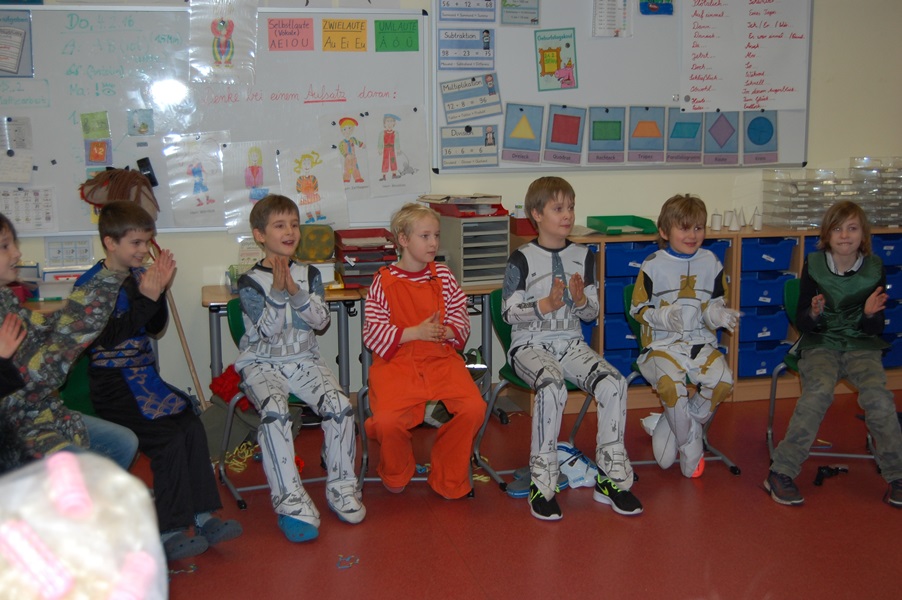 Alle Kinder kamen verkleidet zur Schule. Es gab viele verschiedene Kostüme: Pippi Langstrumpf, Vampire, Bienen, Drachen, Dinos, Cowboys und Cowgirls, Piraten, Indianer, Oktoberfest feiernde Menschen…